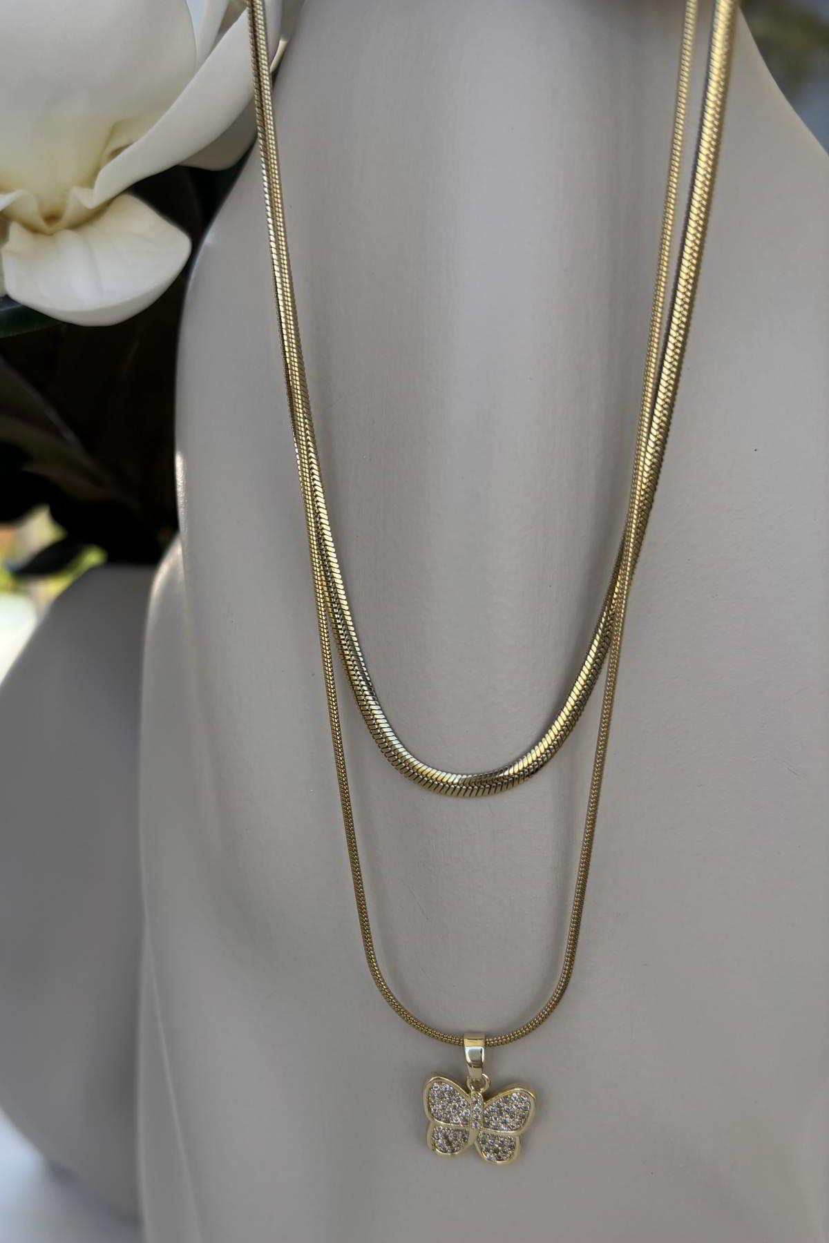 Çelik 316L 14K Çift Zincir Kelebek Kolye (KLYC578)