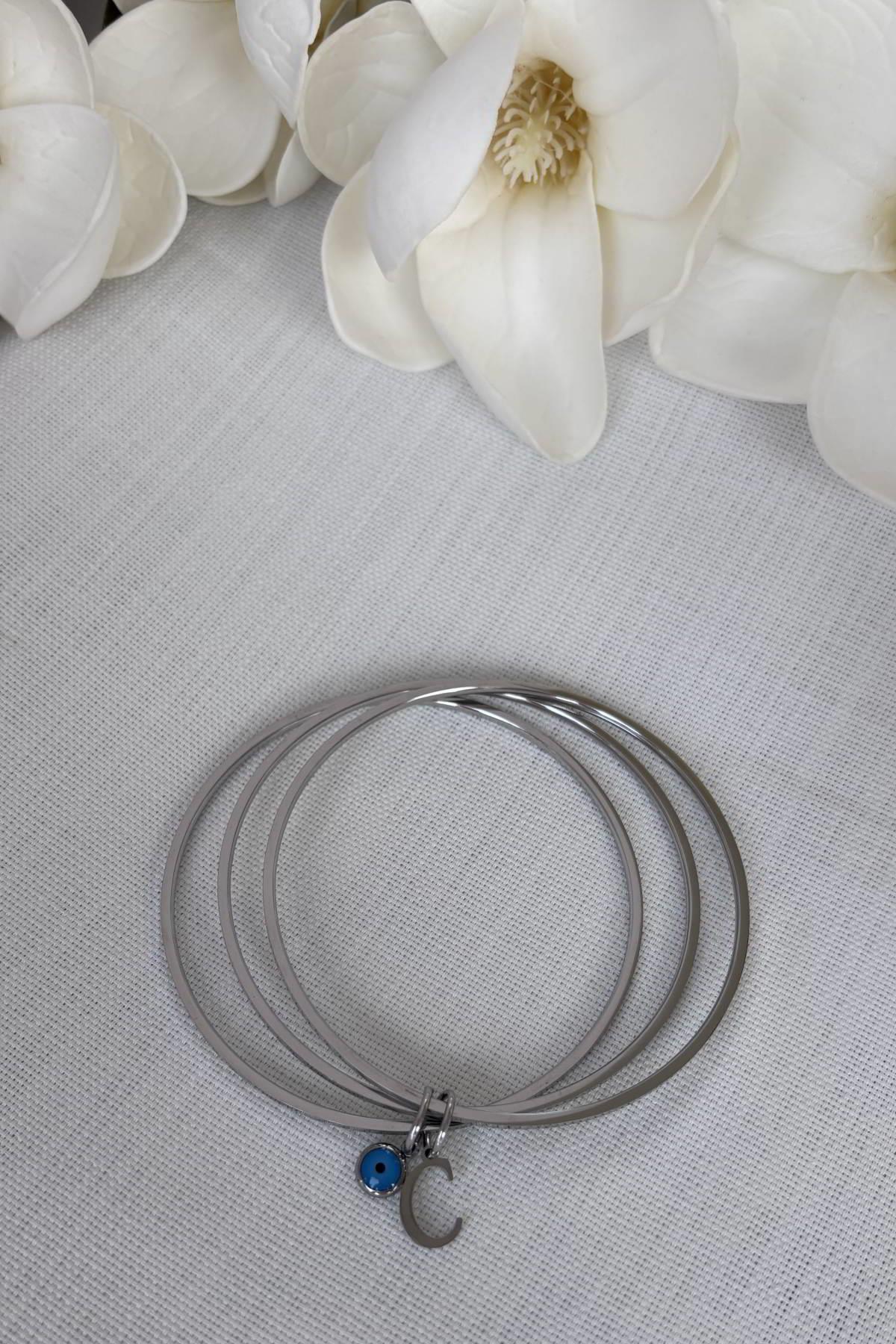 Çelik Gümüş Nazar Boncuklu C harfi Bilezik (BLKC292)