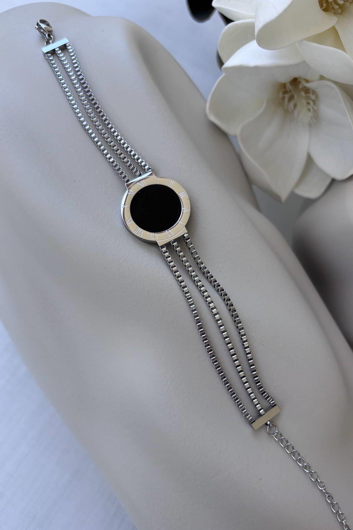 Çelik Gümüş Romen Rakamlı Siyah Taşlı Bileklik (BLKC287)