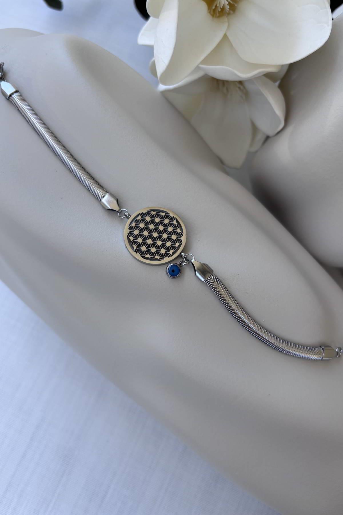 Çelik Gümüş Yaşam Çiçeği Bileklik (BLKC288)